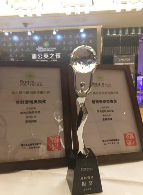 2016年11月5日,第三屆中國創(chuàng)新傳播大獎——蒲公英獎在北京揭曉,思美數(shù)字憑借“華為花粉俱樂部”案例,摘得渠道組社群營銷類銀獎、技術(shù)組智能營銷類銀獎兩大獎項。
