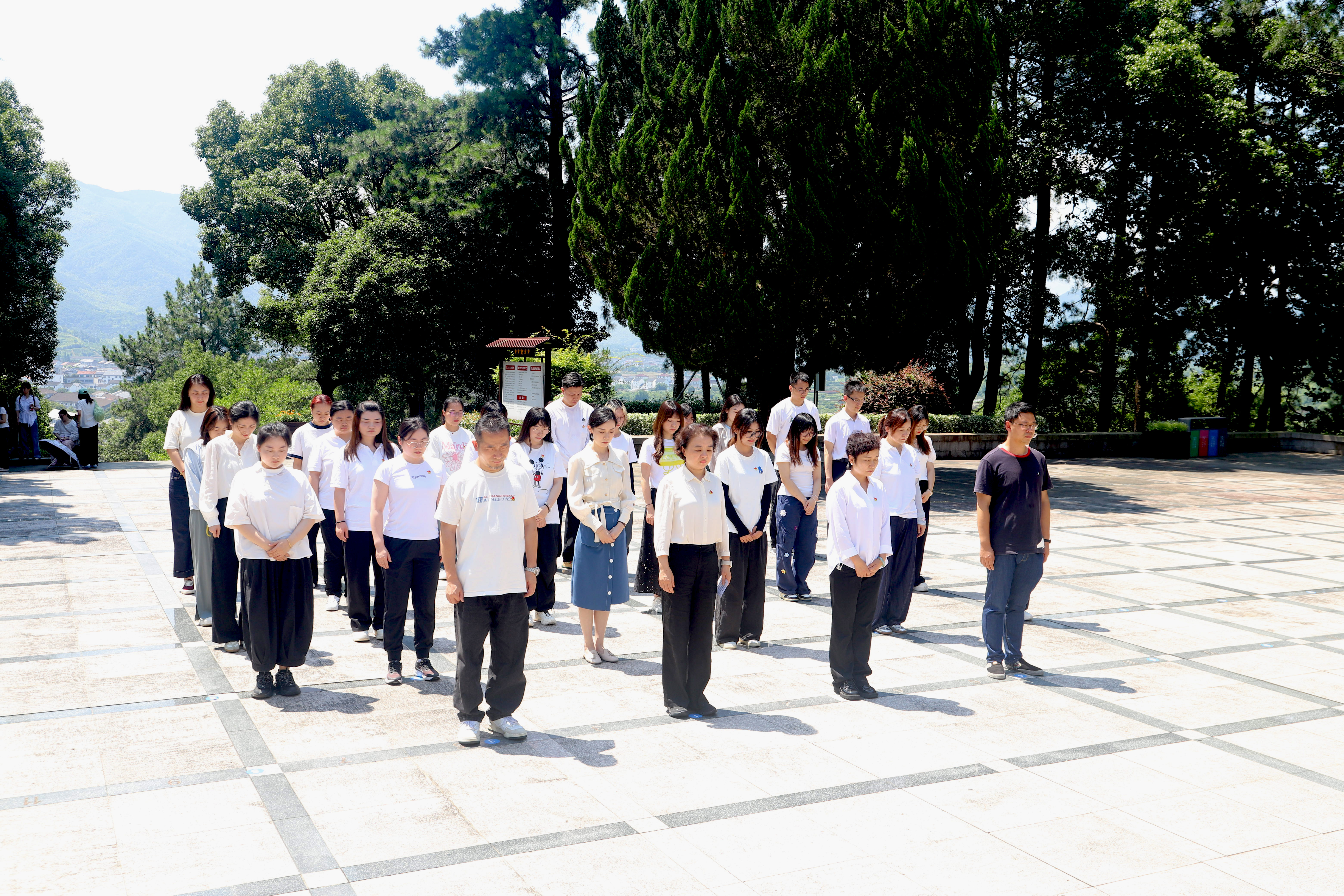 全體人員首先來到四明山革命烈士紀念碑園區,懷著崇敬之情在紀念碑前舉行祭奠儀式。領導代表張莉、俞建華同志上前整理花圈挽聯,全體黨員列隊肅立,向革命先烈鞠躬致哀。
