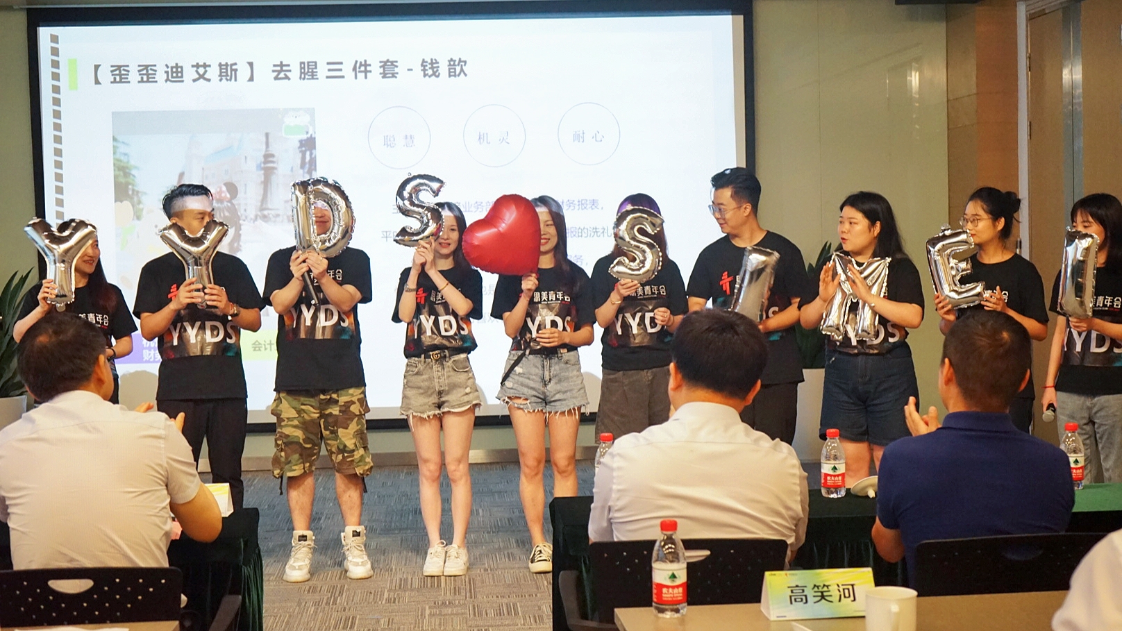 團隊展示環(huán)節(jié)是每年開營儀式的“保留節(jié)目”。本屆青年會成員按照自由組合的原則組成4支團隊,分別上臺進行團隊展示。各支團隊都做了精心準備,通過設計logo、定制團服、高喊口號等方式彰顯團隊精神;組員充分發(fā)揮各自的特長與優(yōu)勢,以拍攝視頻、改編歌詞等形式凸顯個人風采。富有創(chuàng)意、朝氣蓬勃、元氣滿滿的團隊介紹贏得了底下陣陣喝彩。